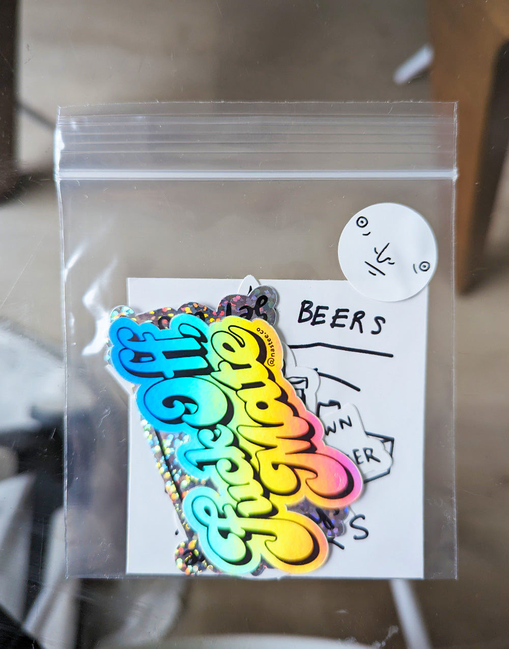 Here by popular demand! We have STICKERS! Featuring some of our most popular designs like a shimmery, glittery SHOULD WE GET A BAG to a brand new holographic design FUCK OFF, MATE. Get Nastee with our limited quantity sticker pack of 5 fun stickers and it includes a souvenir baggie.